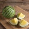 An improvement over Sunshine, this "icebox" melon is more widely adapted and produces a more flavorful, harvestable yield under adverse conditions. Attractive dark green skin with narrow, dark green stripes (the same stripe pattern as Dark Belle). The sweet, bright yellow flesh is concealed by a thin rind. Yields mostly oval watermelons, with some rounds, avg. 8-10 lb. Avg. 1-2 fruits/plant. Avg. 8,000 seeds/lb. Packet: 15 seeds.